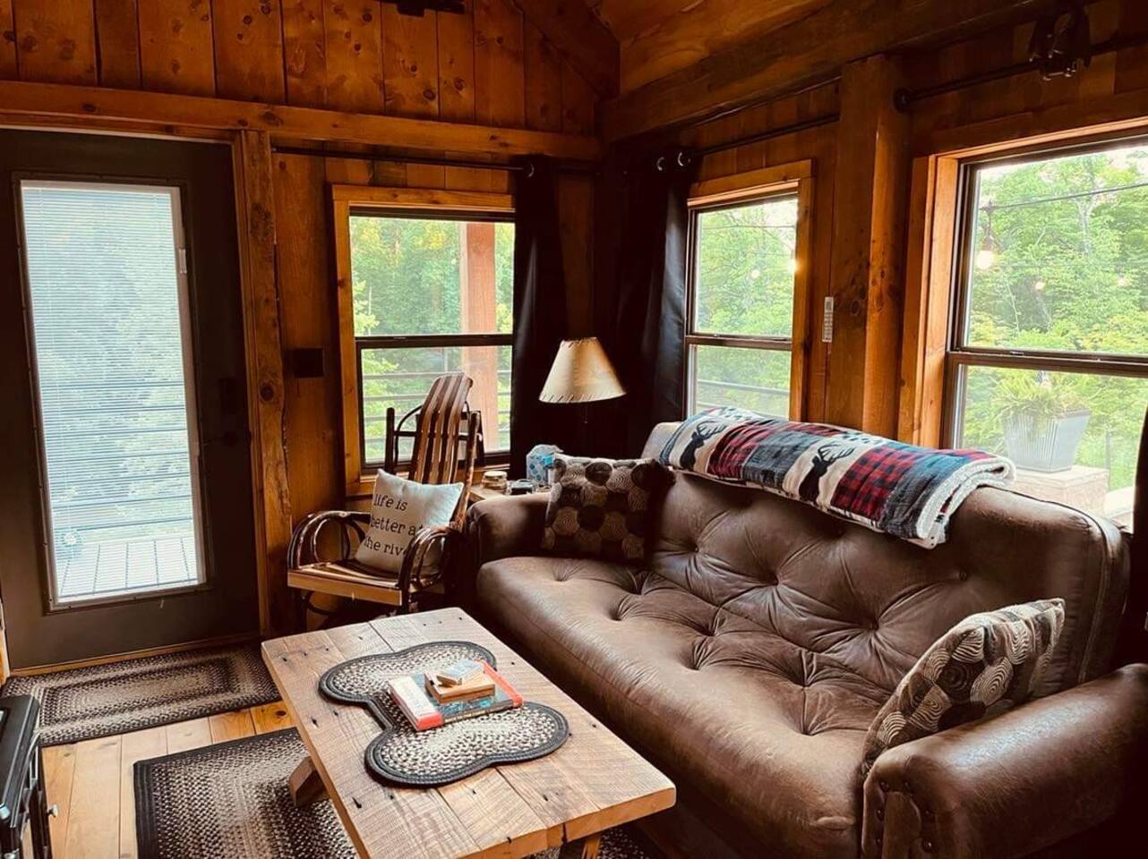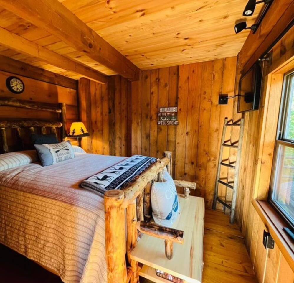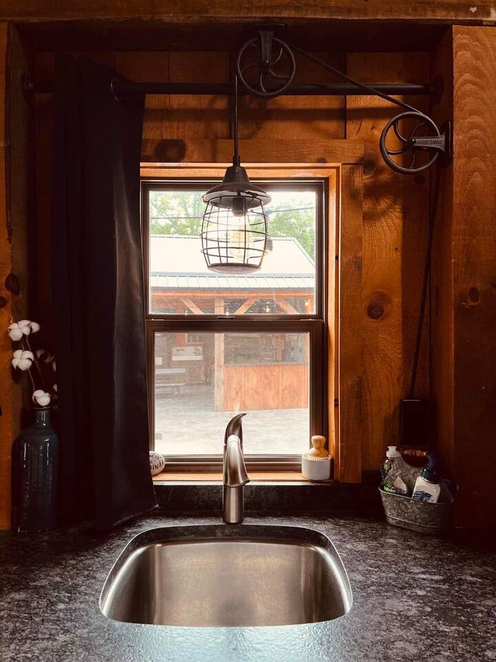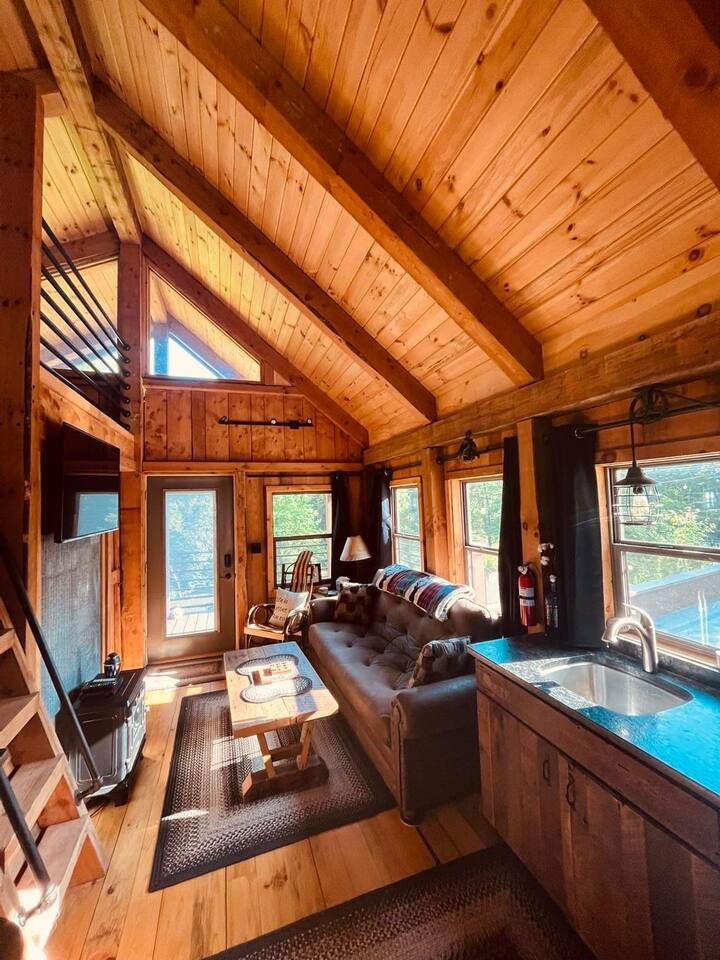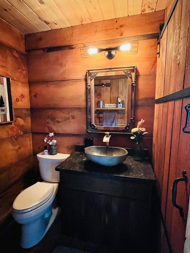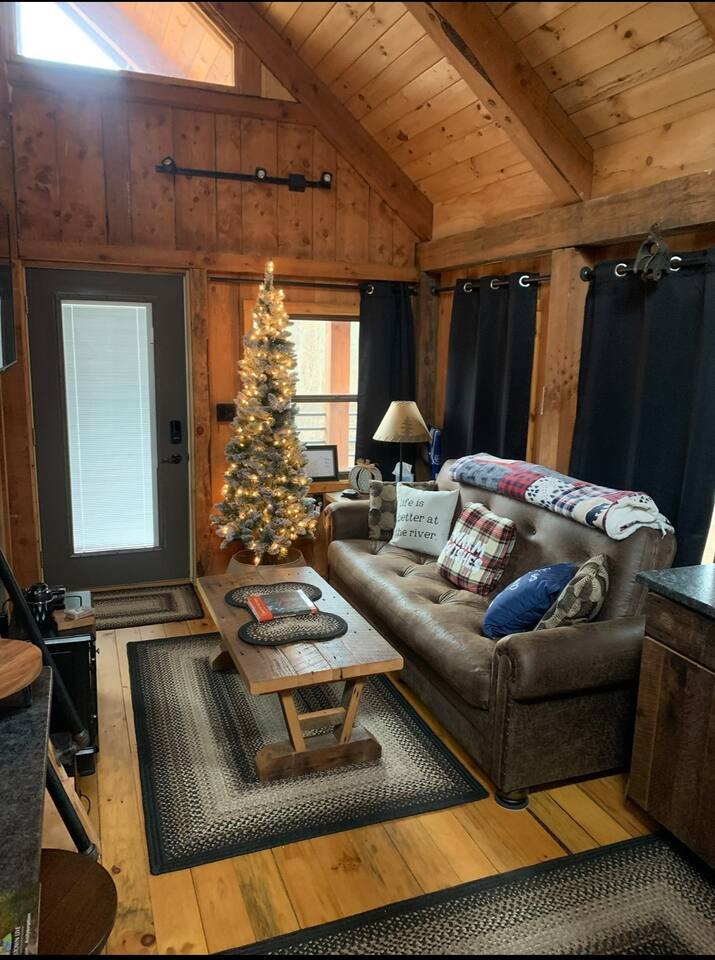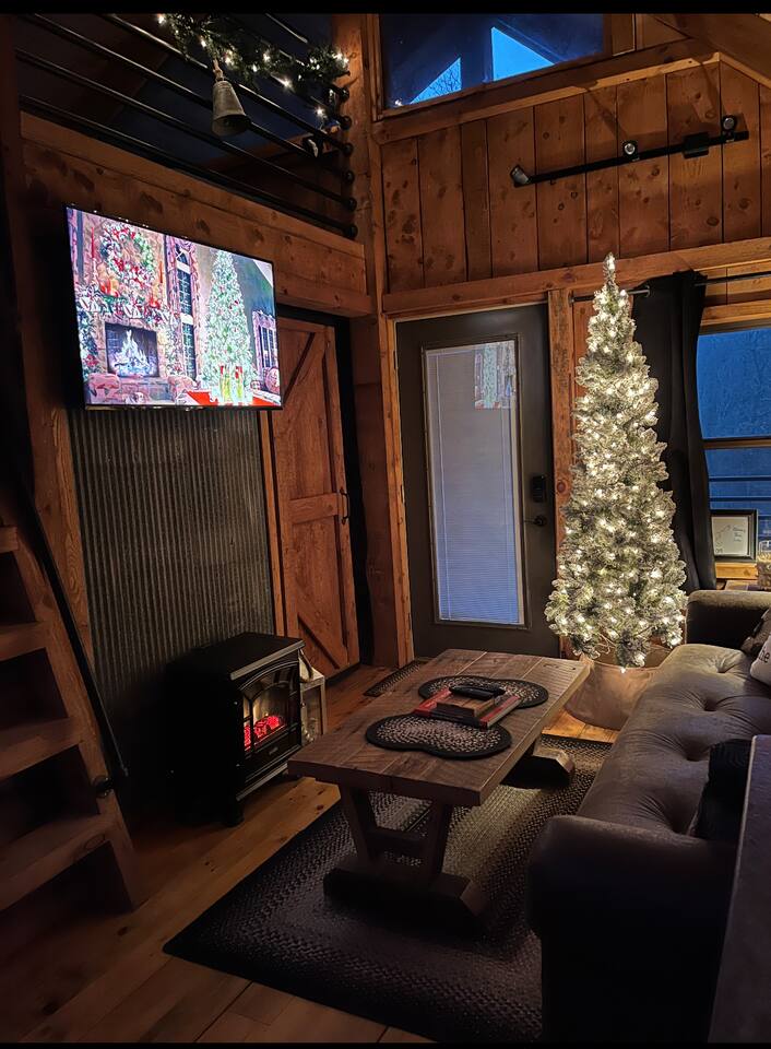 The Cabin offers a cozy & welcoming feel with an open kitchen & living room area. The kitchen includes a Ninja Foodie Air Fry Oven, a fully stocked coffee bar, a toaster, microwave, & electric cook top. The living area provides a sofa, coffee table, Smart TV with Netflix, games, and an electric fireplace. The bedroom features a full size bed, a Smart TV with Netflix. The bathroom has a walk in shower, toilet, and sink.