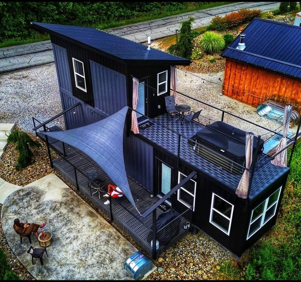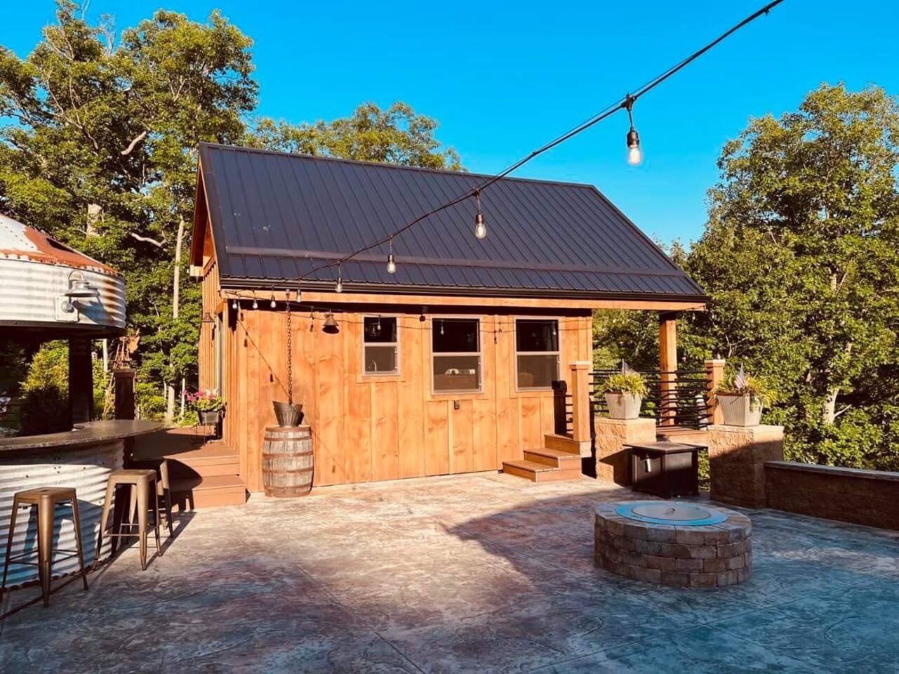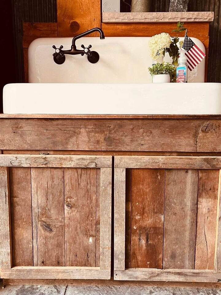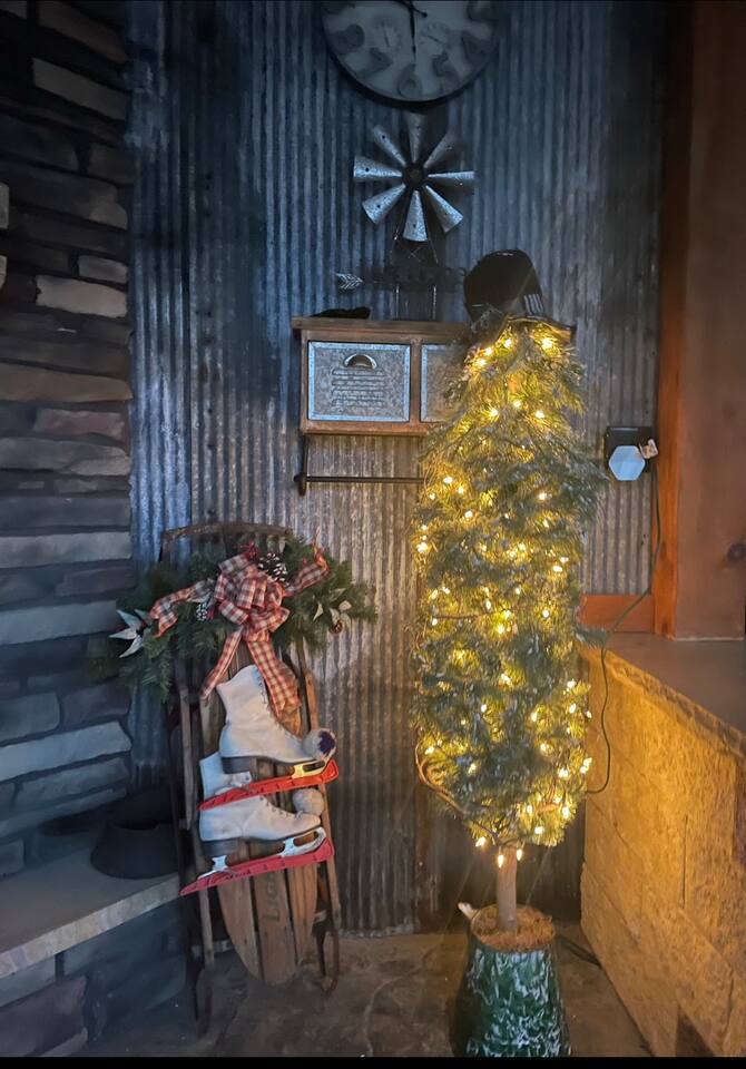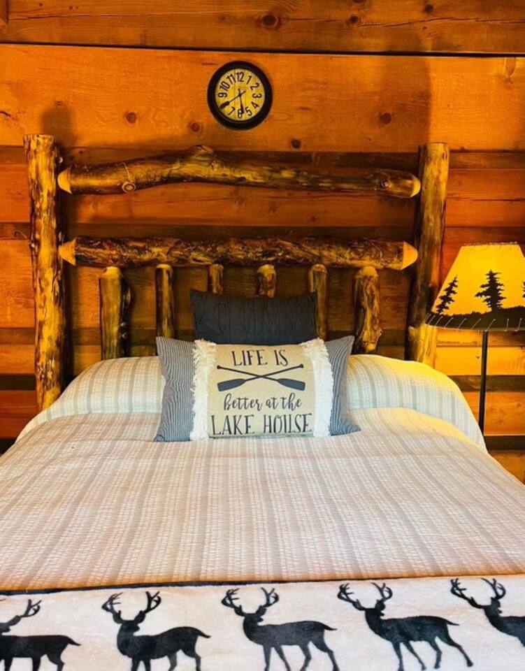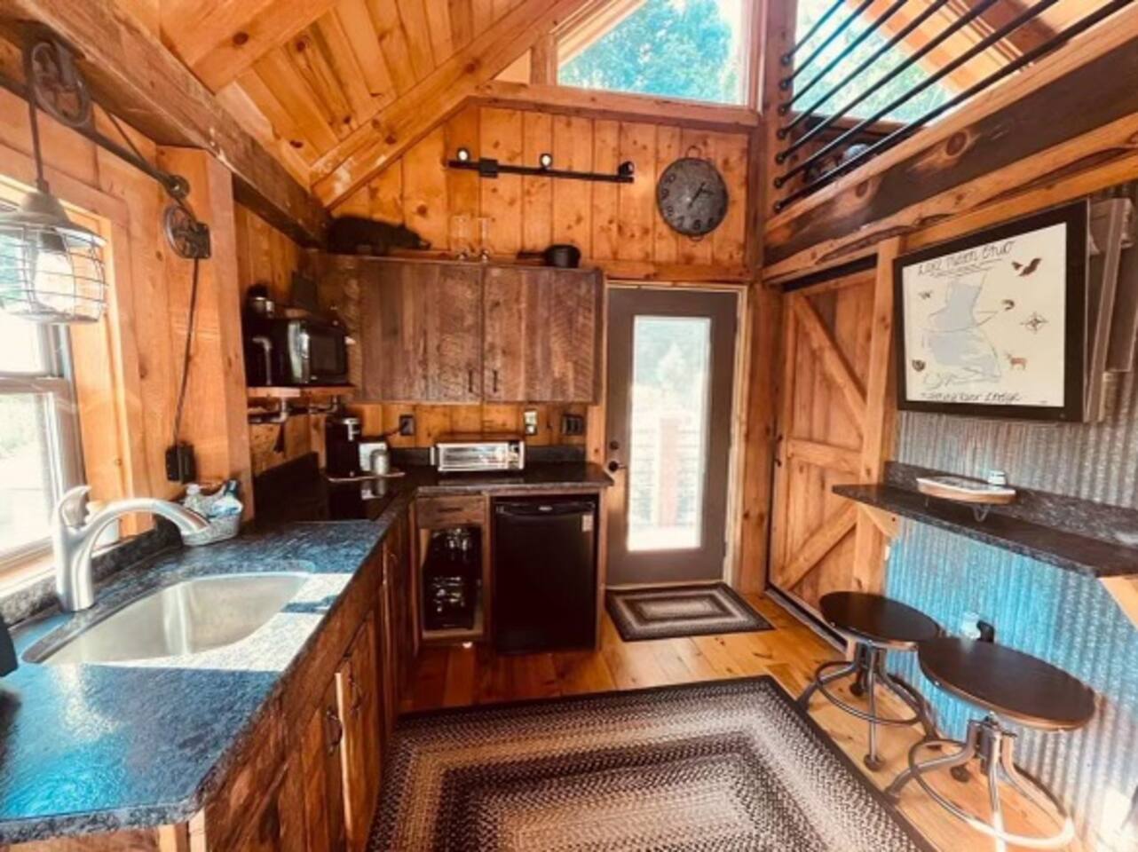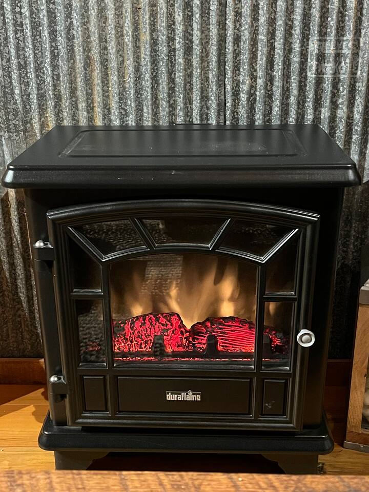 The Cabin offers a cozy & welcoming feel with an open kitchen & living room area. The kitchen includes a Ninja Foodie Air Fry Oven, a fully stocked coffee bar, a toaster, microwave, & electric cook top. The living area provides a sofa, coffee table, Smart TV with Netflix, games, and an electric fireplace. The bedroom features a full size bed, a Smart TV with Netflix. The bathroom has a walk in shower, toilet, and sink.